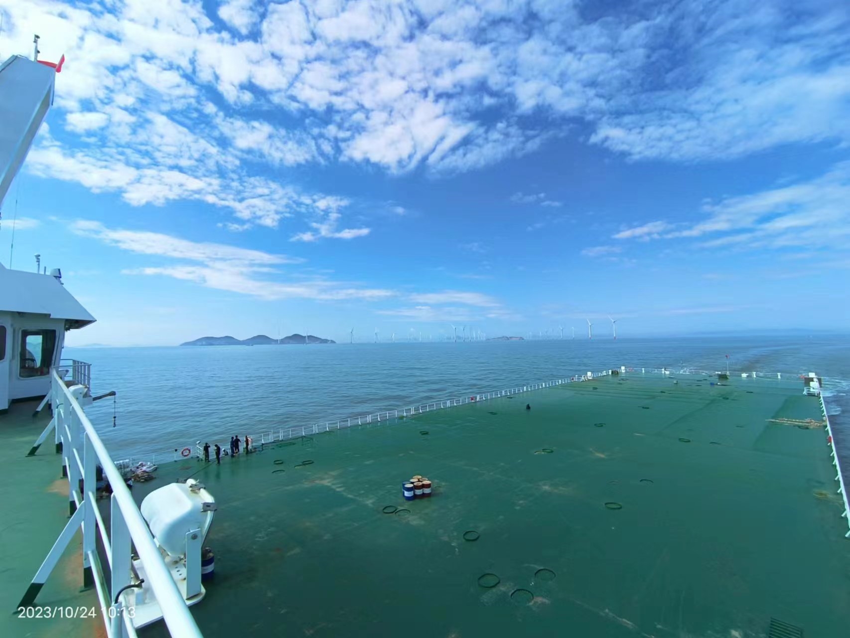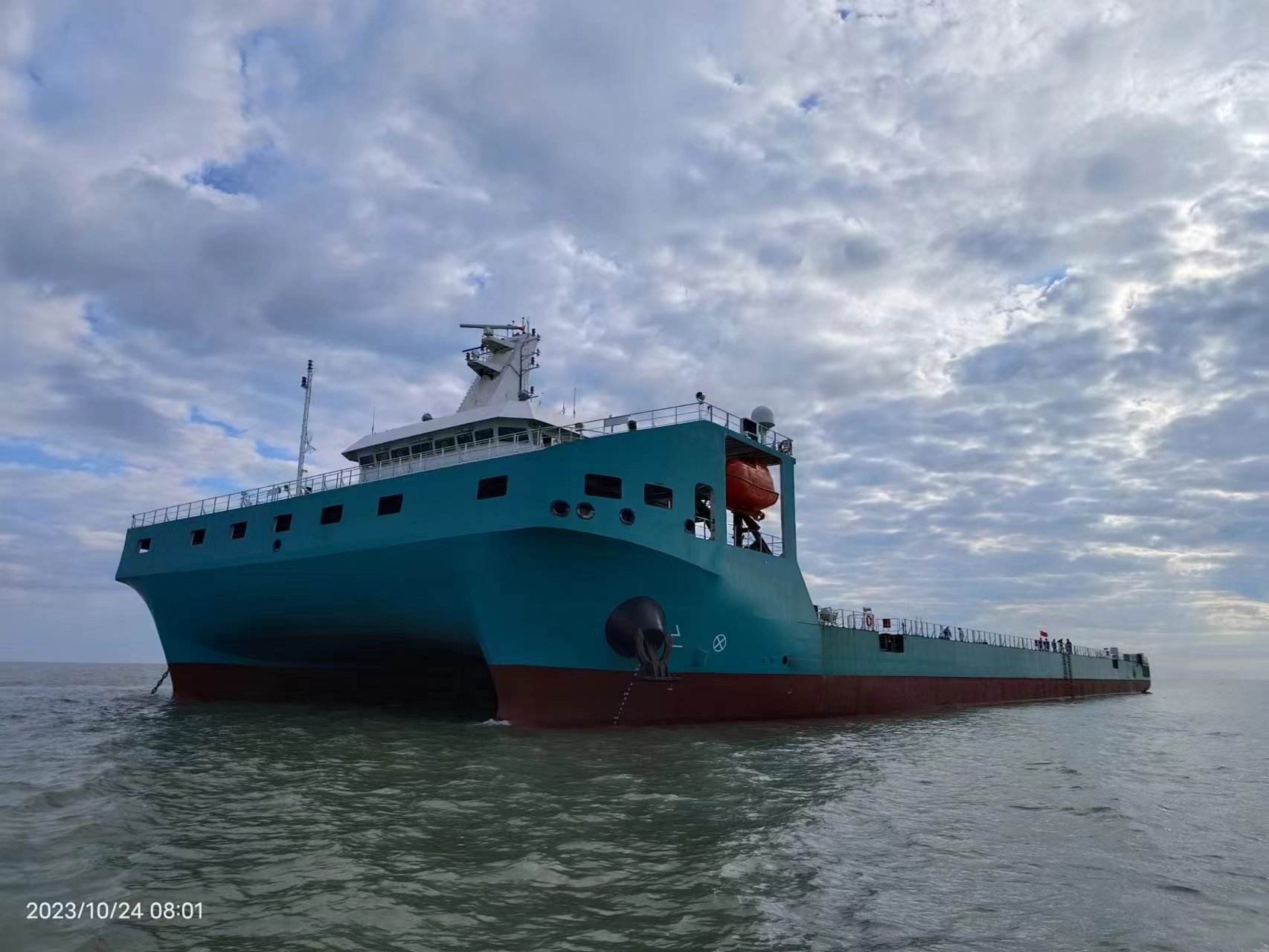 江海直达多用途双体运输接驳船,该船目前在航,甲板面积5000平方米,DP2动力定位系统。