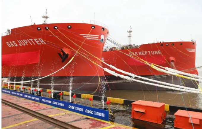 5月24日中国船舶集团旗下江南造船为西南海运建造的两艘93000立方米超大型液化气船(VLGC)在公司9号码头分别被命名为“ GAS JUPITER”(H2756船)和“ GAS NEPTUNE ”(H2757船)。