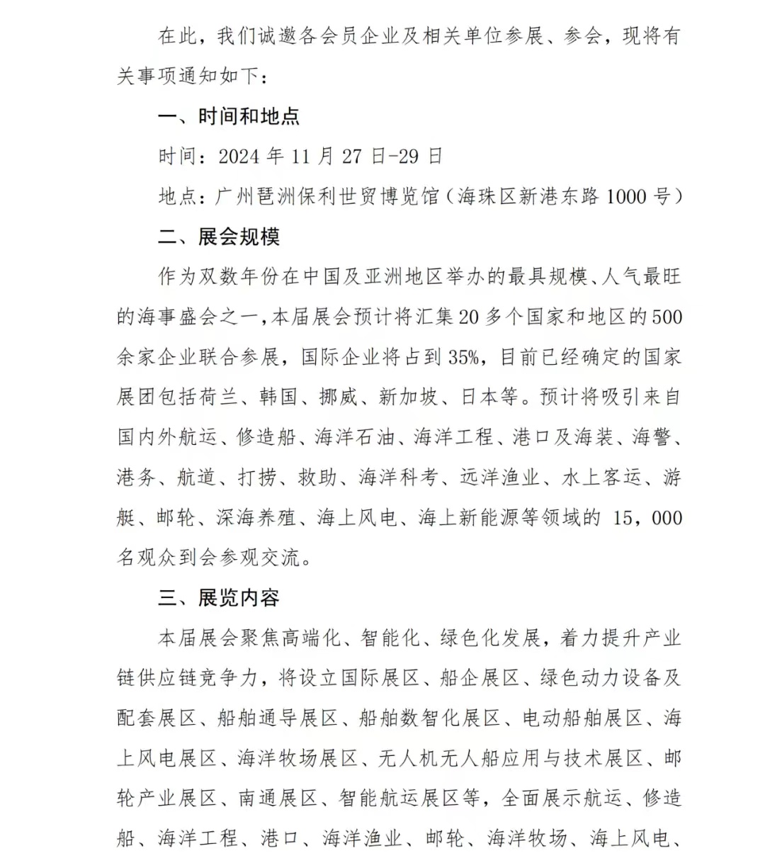 11月27日-29日,诚邀海洋石油、海洋工程、海洋风电、航运、造修船、海洋渔业、海洋科考、水上客运及港务、海装、海事、海警、航道、打捞、救助等领域的专业观众,莅临广州琶洲保利世贸博览馆,在2024造船新周期,探索发展新机遇。